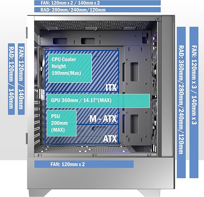 - [Expansión notable] - (1) La caja de computadora para juegos de torre media admite placas base ATX / Micro-ATX / Mini-ITX. (2) Admite radiador de 360 mm (3) Altura máxima del enfriador de CPU 190 MM (4) Longitud máxima de GPU 360 MM (5) Tipo de fuente de alimentación ATX hasta 200 MM (6) Equipado con soporte para HDD y SSD (7) Ranuras de expansión 7 + 3 piezas. (8) Hasta 9 ventiladores de PC de 120 mm.